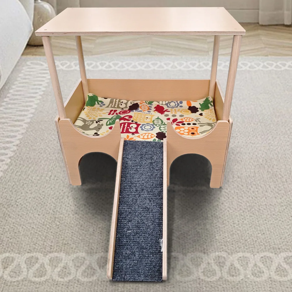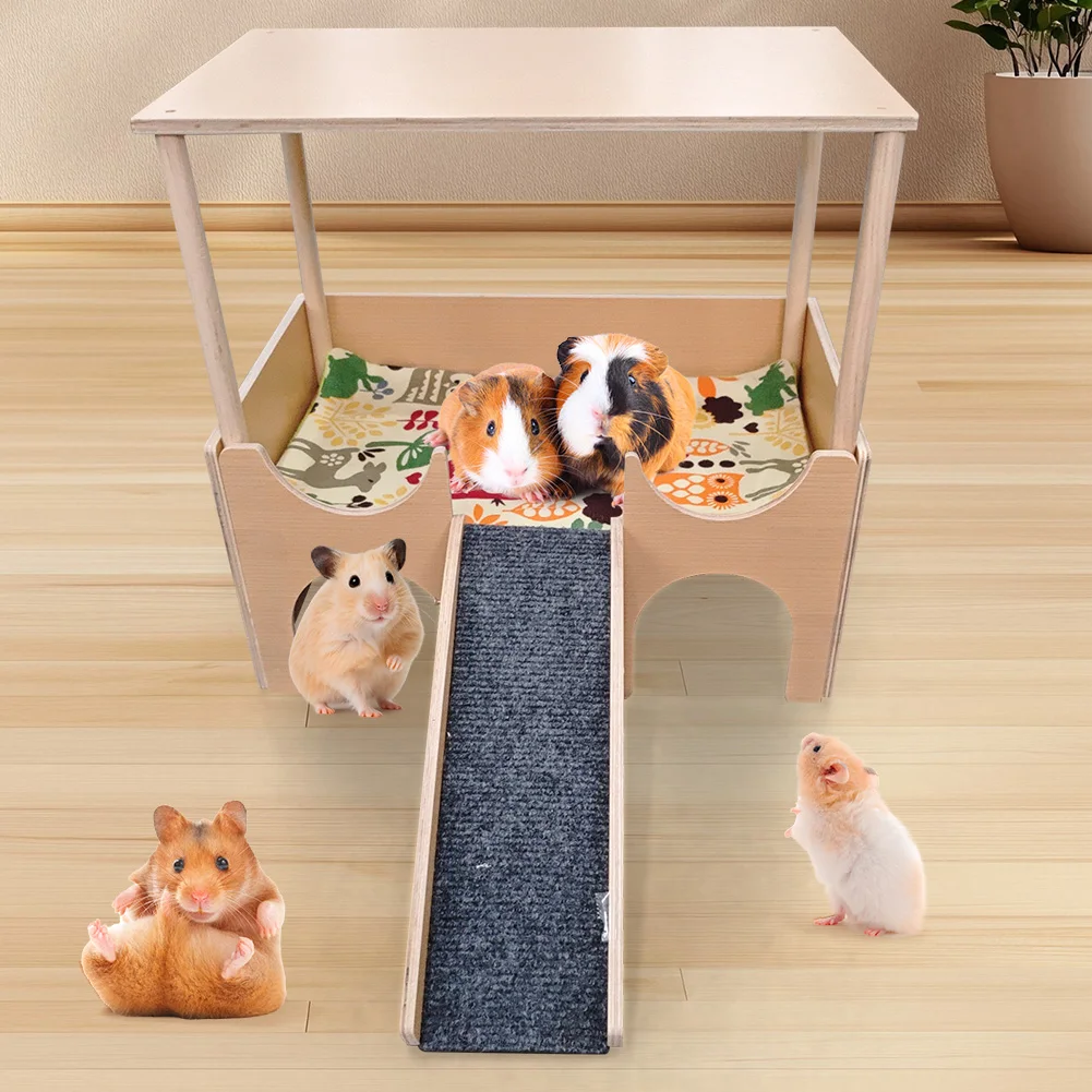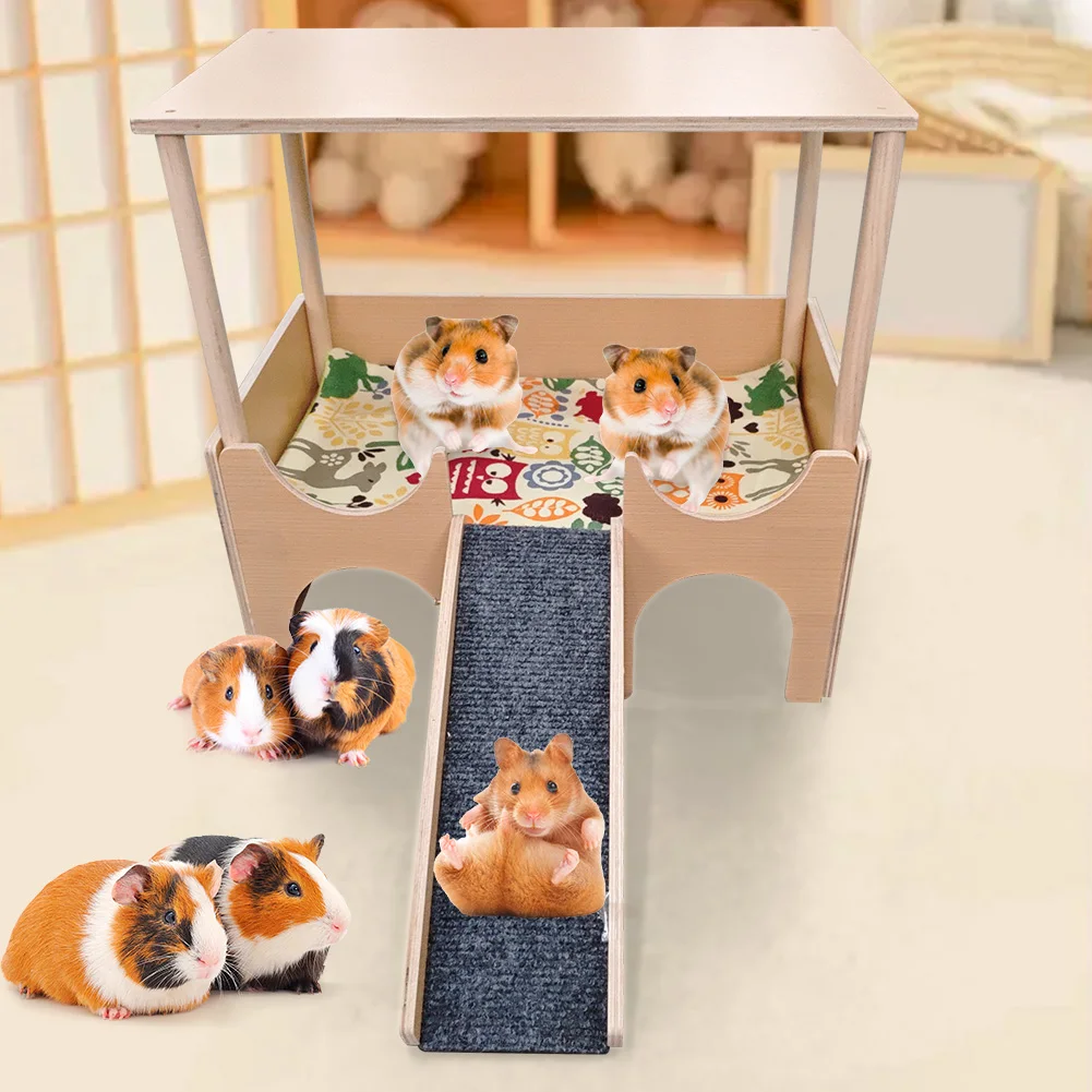 Features: 1.Multi-Layer Design: The comfortable upper guinea pig hideout is connected to the spacious lower layer by sturdy wooden stairs, for small pets to explore and play. 2.Sturdy Construction: Made from solid wood material, ensuring lasting stability and safety for supporting small animal house daily activities. 3.Versatile Habitat: Suitable for various small pets like guinea pigs, hamsters, chinchillas, and rabbits, functioning as a guinea pig castle or resting area. 4.Easy Assembly: Simple snap-on design requiring no tools, allowing quick installation and easy cleaning as needed. 5.Spacious Size: Provides ample resting and play space for small animals, with multiple entrances for easy access. Specification: Origin: Mainland China Material: wooden multilayer board Applicable season: all seasons Product size: 38*35.6*25.3cm/15*14*9.06in (length*height*width) Ladder length: 31cm/12.2in Warm reminder: you need to assemble it yourself
