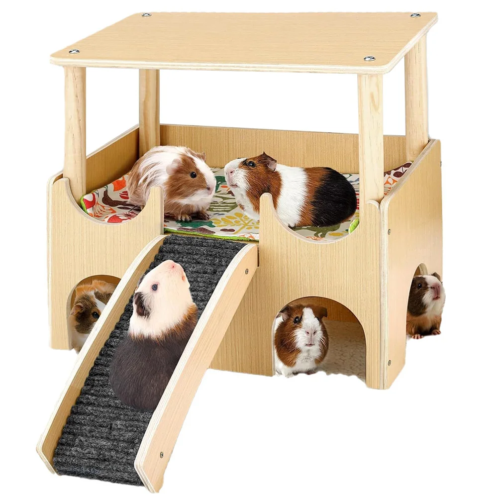 2-Tier Guinea Pig Hideout Wooden Guinea Pig Castle with Stairs Small Animal House for Hamsters Bunny Chinchillas Playing Hiding