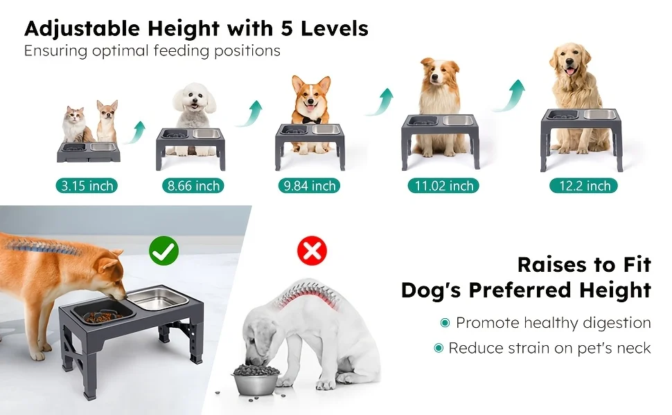 Customize the perfect height (3.15" to 12.2") for any dog, from Chihuahuas to Great Danes. Promotes better digestion, reduces neck strain, and helps prevent bloat.