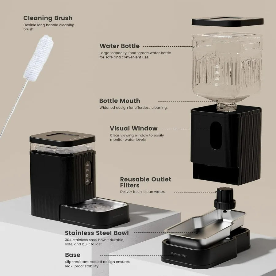 Premium Pet-Safe Materials - Gardner Pert dog water bowl dispenser comes with 304 stainless steel bowl + cleaning brush guarantees a safe, easy-to-clean water supply for pets.