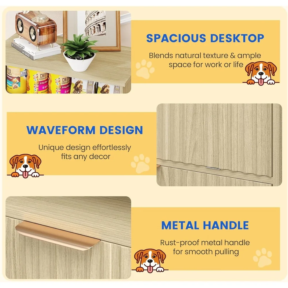 Organize your pet's mealtime in style with this elegant all-in-one feeding station. Featuring elevated stainless steel bowls in a pull-out drawer, a tilt-out dry food cabinet, and an open shelf for treats, it promotes healthier eating and keeps everything neat. Crafted from sturdy MDF with a fluted design and oak wood tone, it blends seamlessly with any décor. With ample storage and strong support, it doubles as a chic end table, perfect for any room.