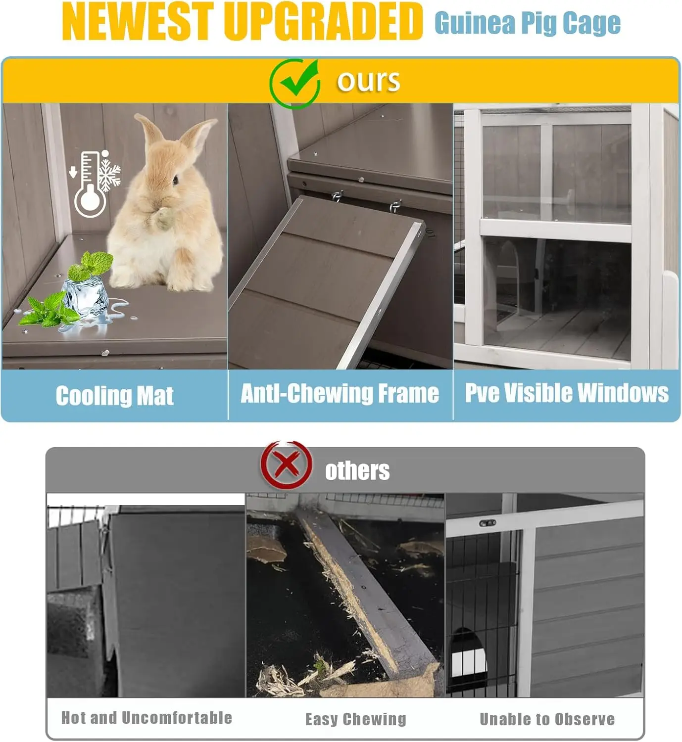 - 🐹【Reversible Cooling Panel】The bunny house features a reversible cooling panel to ensure your pets' comfort during hot weather. It can be flipped to provide extra insulation during colder months. The secure, lockable door on these guinea pig and bunny cages ensures your pets' safety at all times. Easily accessible for all your pet housing needs.