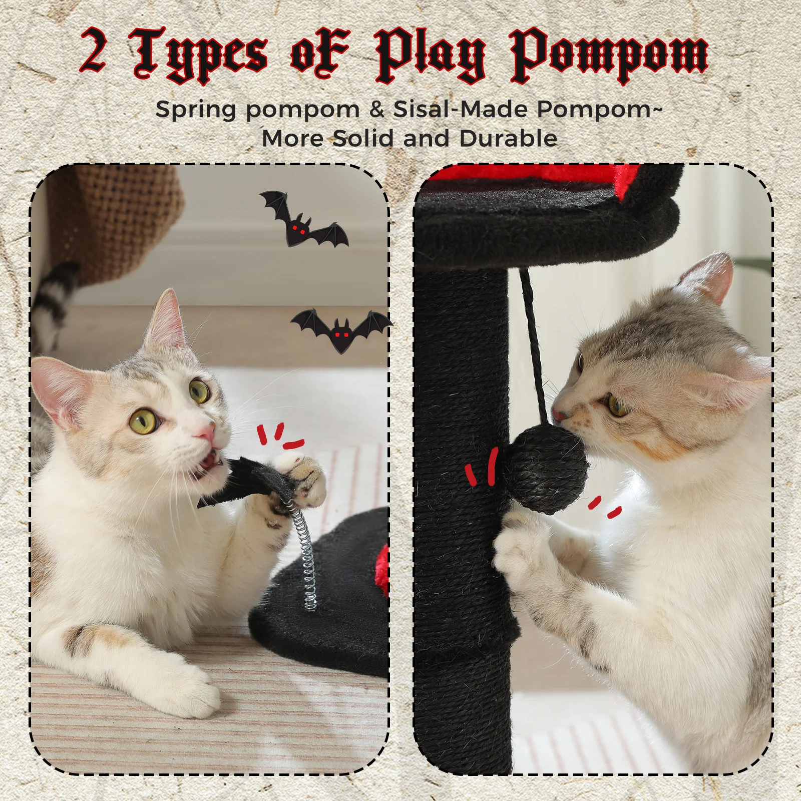 2 BALLS FOR MORE HAPPINESS: This cat scratching post comes with 1 hanging sisal ball and 1 spring bat toy for your cat to play with. They are on the scratching post and on the base plate, you can remove them as you like. This is a great interactive toy for cats when they are alone